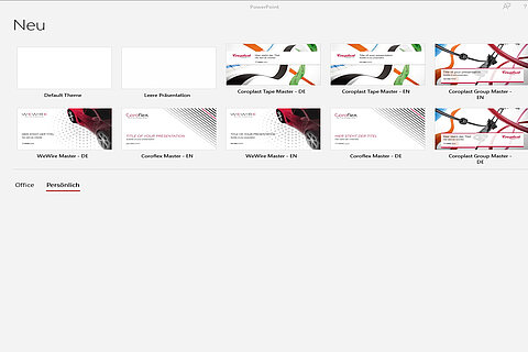 In unserem Brandportal stellen wir Ihnen eine Vielzahl hilfreicher Informationen zur Erstellung ansprechender Vorträge für ihren Fachbereich zur Verfügung. Die PowerPoint-Mastervorlage für Präsentationen Ihres Geschäftsbereichs sowie der Coroplast Gruppe können direkt beim Start von PowerPoint ausgewählt werden. Die globale Unternehmenspräsentation der Coroplast Gruppe (DE & EN) sowie Bilder für Präsentationen finden Sie im Intranet im Bereich Marketing & Kommunikation.