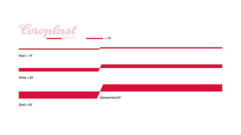 Die abgerundeten Ecken des Logos werden bei diesem Element bewusst nicht verwendet. Der schräge Versatz der verschobenen Linie wird ebenfalls aus dem Logo übernommen. Hierfür ist ein Winkel (InDesign) von 24° festgelegt.
