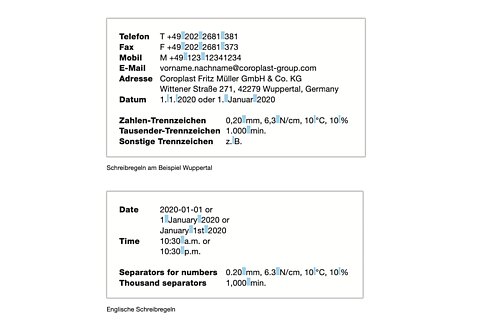 Bei der Schreibweise der Adress- bzw. Kontaktdaten sowie bei Zahlen und dem Datum sind auf unsere CD-Regeln zu achten. Wenn möglich, soll unsere Hausschrift Neue Helvetica verwendet werden. Alternativ wird die Systemschrift Arial eingesetzt.