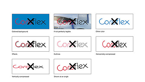 Here are a number of examples illustrating ways in which the Coroflex logo may not be used. The logo can be placed on an image motif provided that it is still perfectly legible.