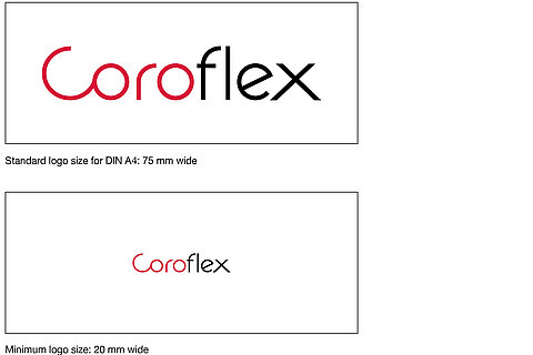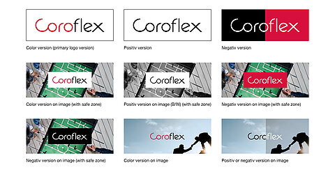 The logo is always used in the colored version insofar as permitted by technical printing constraints. It is placed free on a white background. The primary color of Coroflex is red in combination with black. If the logo is to be placed on a colored background or on photographs, the color application in the corresponding area may not exceed 10%. For dark or red backgrounds, the negative version of the logo (white) should be used. For light backgrounds and black-and-white applications, the logo should be used in 100% black.