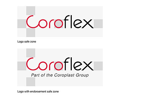 A protection zone is defined for the Coroflex logo; this specifies the minimum distance from other elements. This protection area is defined by the size of the lower case “o” in the Coroflex lettering.