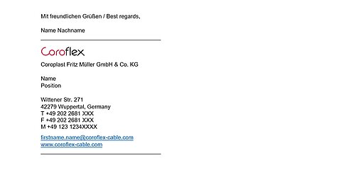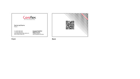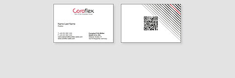 The front of the card has a simple design with the Coroflex logo and the employee’s details. In line with the Coroflex’s international image, the position of the employee is always given in English. The name of the country in the address remains in the international format, e.g. “Germany.” The back of the card features the “shutter” graphic element of our corporate design. The QR code, which can be used to access the employee’s key information, is placed in the center of the card.
