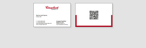 The front of the card has a simple design with the Coroplast Tape logo and the employee’s details. In line with the Coroplast Tape's international image, the position of the employee is always given in English. The name of the country in the address remains in the international format, e.g. “Germany.” The back of the card features the “clip” graphic element of our corporate design. The QR code, which can be used to access the employee’s key information, is placed in the center of the card.