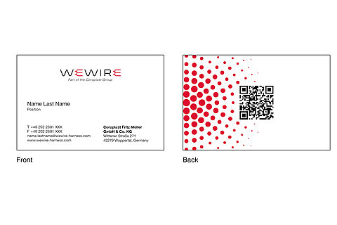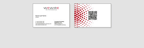 The front of the card has a simple design with the WeWire logo and the employee’s details. In line with the Coroplast Group’s international image, the position of the employee is always given in English. The name of the country in the address remains in the international format, e.g. “Germany.” The back of the card features the “pulsar” graphic element of our corporate design. The QR code, which can be used to access the employee’s key information, is placed in the center of the card.